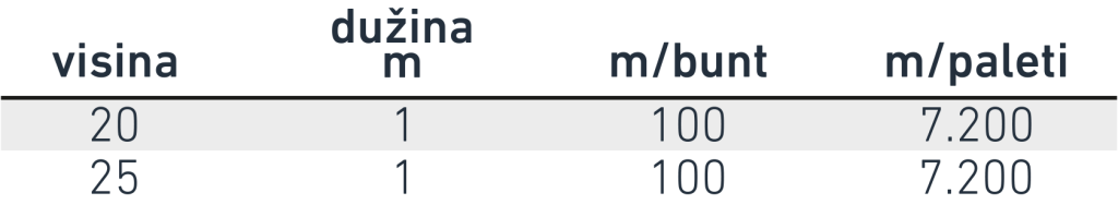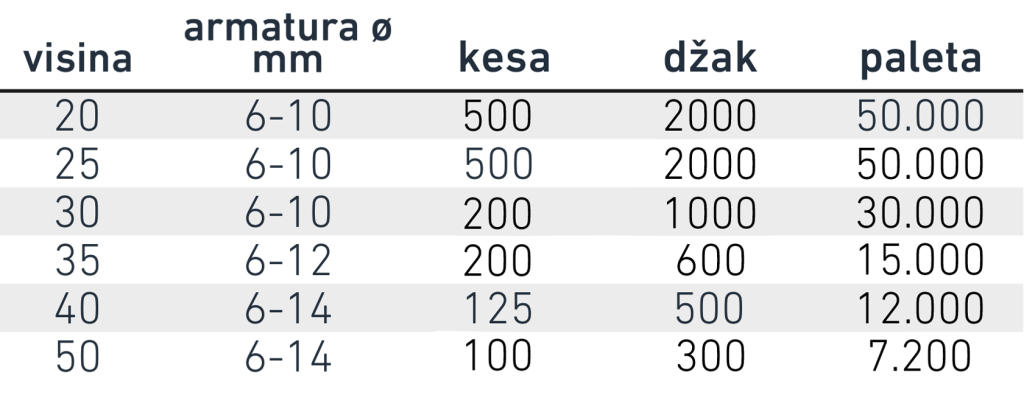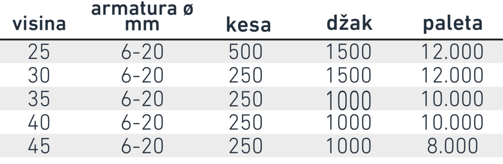 Veliki i stabilni plastični distancer (odstojnik), za donju armaturu. Za srednje i teške armature. Dobar protok betona zbog velikih bočnih I gornjih otvora. Isporučuje se u dužini od 2m; spojena dva komada od 1m koji se mogu rastaviti. Izrađen od 100% recikliranog materijala.