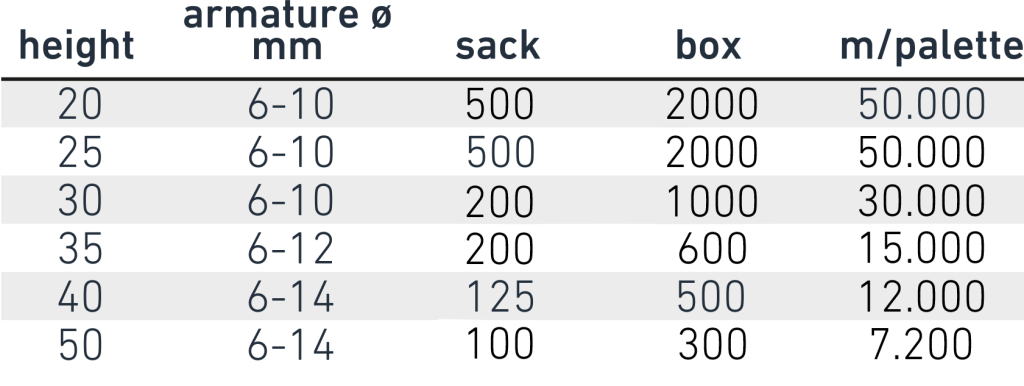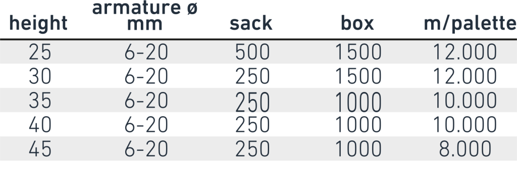A large and stable plastic spacer (standoff) for the lower armature. Suitable for medium and heavy-duty armatures. It ensures a good concrete flow due to its large side and top openings. It is delivered in a length of 2 meters, consisting of two pieces of 1 meter each that can be separated. Made from 100% recycled material.